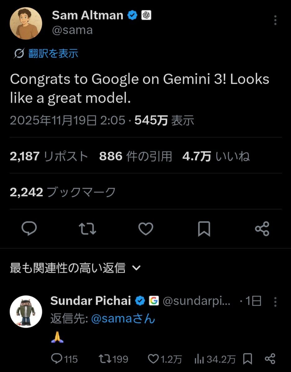 Grok4.1を潰すために急に出したのかな ChatGPT5の時みたいにカウントダウンしてくれるとワクワクなんだけどな pic.x.com/hHehqBkFb1 x.com/sundarpichai/s…