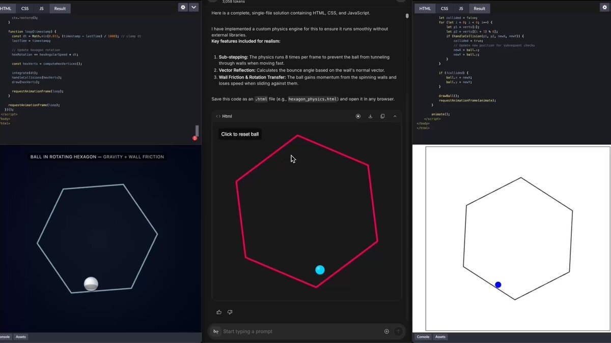 Alex Prompter @alex_prompter ChatGPT (left) vs. Gemini 3.0 vs. Grok 4.1 (right) Gemini finished in 30 seconds. Took 2 minutes for ChatGPT and Grok. --- 右のがGrokなら硬い球体とすれば自然な感じ 真ん中がGeminiなら球体自ら飛んで行く場面が見受けられるので不自然 出来るのか... x.com/alex_prompter/…