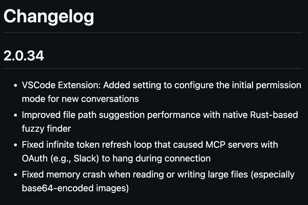 Claude Code 2.0.34: 【機能】 ・VSCode: 新規会話開始時のツール使用許可設定を追加 ・Rust ベースのFazy Finderによるファイルパス提案の工場 【すううせい】 ・OAuth認証を使用するMCPサーバーの接続時の問題を修正(e.g. Slack) ・大きいファイル処理時のメモリクラッシュを修正 pic.x.com/Hb8OlVb2CB