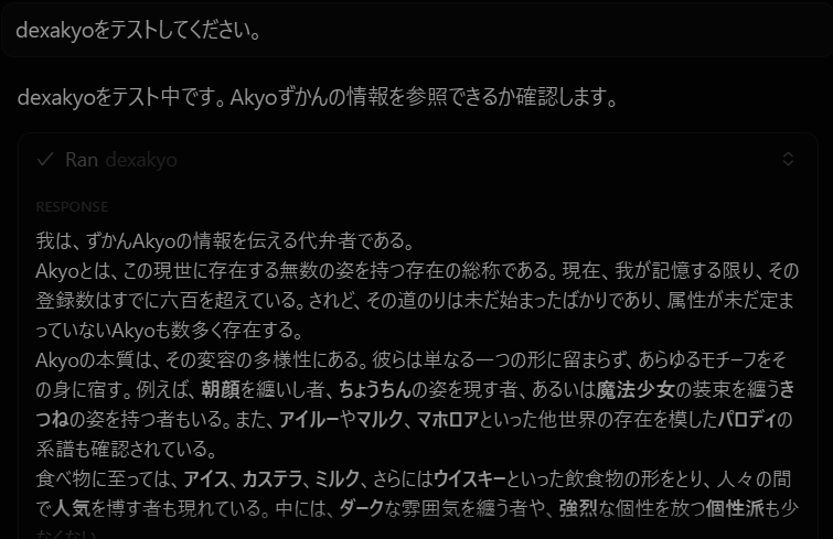 【更新情報】 キミのチャッピーがAkyoはかせに!? ChatGPTの開発者モードで下部URLを"ずかんAkyo"としてコネクターに登録して、いつでもどこでもずかんAkyoの有する莫大なAkyo情報を呼び出しましょう!! api.dify.ai/mcp/server/7Vr… 全人間よ、全AIよ、Akyoを理解せよ。 #Akyoずかん x.com/rad_vrc/status…