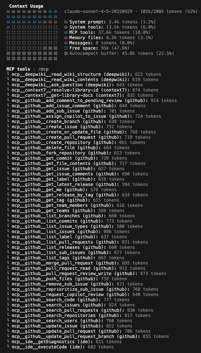 Claude CodeCodexで脳死でGithub MCP入れてたけどめちゃくちゃContext喰ってる。main agentはMCPやめてghコマンドに切り替えるか、特定skillsのみこのMCPを使う、みたいに設定しよう pic.x.com/l6aFcxXp8S