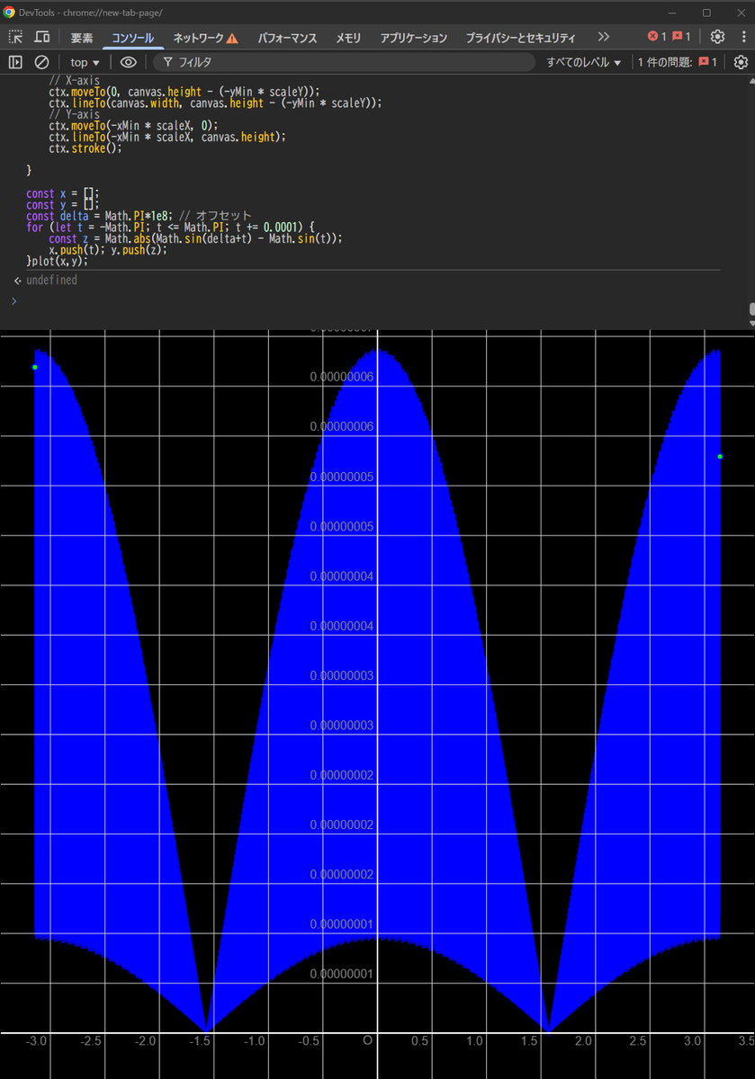 これはjsのdouble型で試してみたが、sinの引数が大きくなる分、double型の仮数部52+1bitの約16桁の有効数字がmod(x, PI)で消費された分の誤差だとよく分かる。float型(仮数部23+1bitの約7桁)や固定少数点(Q1.31、約10桁)だと丸め誤差が大きくなるだろうな。 pic.x.com/vpEq072wsR x.com/Red_Black_GPGP…
