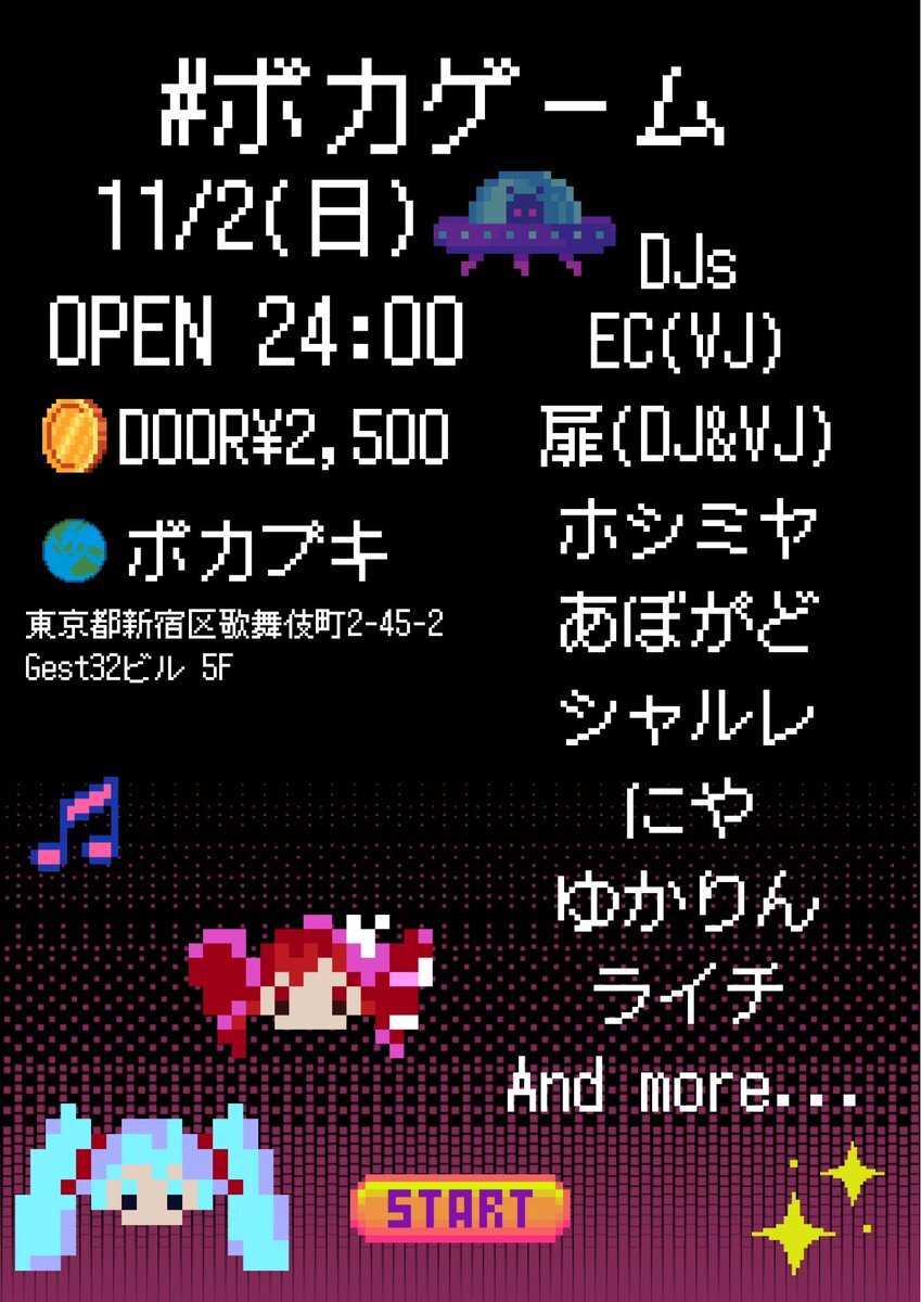 ゲーム 楽曲× ボカロ 楽曲 DJイベント 👾◤◢◤#ボカゲーム◢◤◢🎮 in #ボカブキ 🗓 11/2(日) 24:00- 💰¥2,500- 🉐このポストをRPで500円OFF! 📺 twich.tv/vocabuki 📍ボカブキ =演者紹介= -DJs- 扉 (VJ&DJ) ホシミヤ @hosimiya_star ゆかりん @yukarin_ngmo あぼがど