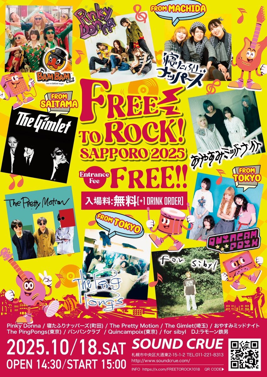 FREE TO ROCK! SAPPORO 2025 10月18日 @ SOUND CRUE (札幌) 入場料: 無料 !!! (+ 1 drink) DJ: ラモーン鉄男 バンバンクラブ Pinky Donna for sibyl The Pretty Motion おやすみミッドナイト The Gimlet / 埼玉 Quincampoix / 東京 The PingPongs / 東京 寝たふりナッパーズ / 町田
