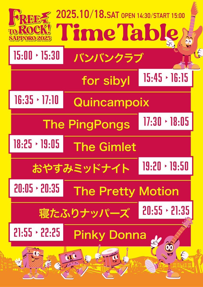 NEXT✈︎ 2025/10/18(土) 札幌Sound Crue FREE TO ROCK!SAPPORO 2025 🎟️無料+1D ⏰OPEN 14:30 / START 15:00 Pinky Donna 寝たふりナッパーズ The Pretty Motion The Gimlet おやすみミッドナイト The PingPongs バンバンクラブ QUINCAMPOIX for sibyl DJ:ラモーン鉄男 カンカンポワは16:35~!! pic.x.com/f8ITDjRv3A