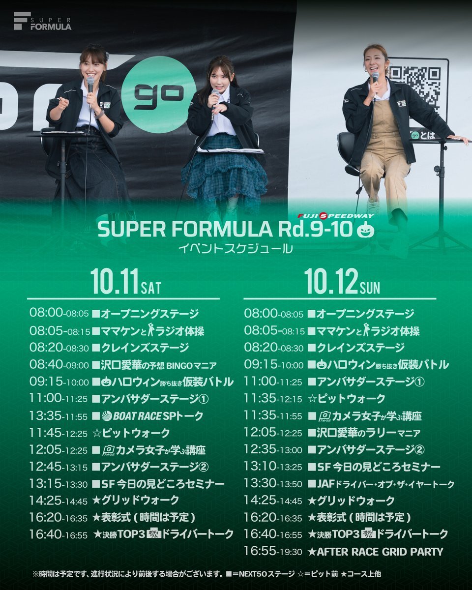 10.11(土)12(日) FUJI SPEEDWAY ▷イベントスケジュール 🗓️ママケンとラジオ🤸‍♀️体操 🗓️ハロウィン🎃仮装バトル 🗓️沢口愛華のラリーマニア など新コンテンツも登場📣 #SFormula #ママケン