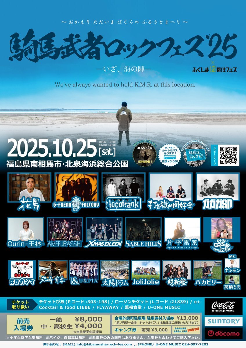 #騎馬武者ロックフェス2025 【10/25(土)】福島県南相馬市・北泉海浜総合公園 [Eチケット] 入場券(一般)¥8,000/(中・高校生)¥4,000 ◎チケットぴあ ◎ローソンチケット ◎e+ (南相馬市) ・Cocktail & food LIEBE ・FLYAWAY (岩手県奥州市) ・萬福食堂 (福島市) ・U-ONE MUSIC にて発売中!