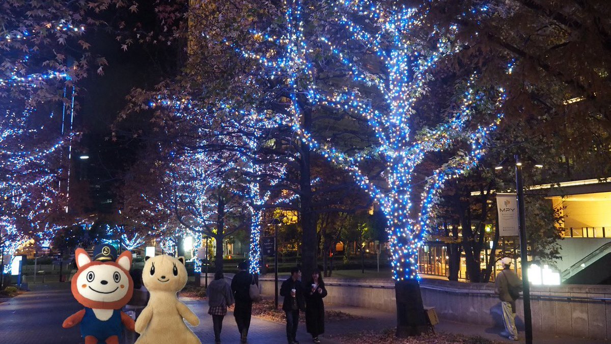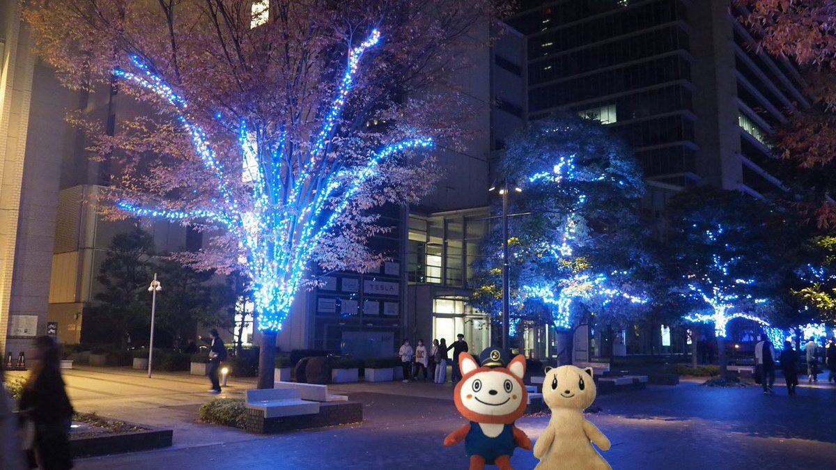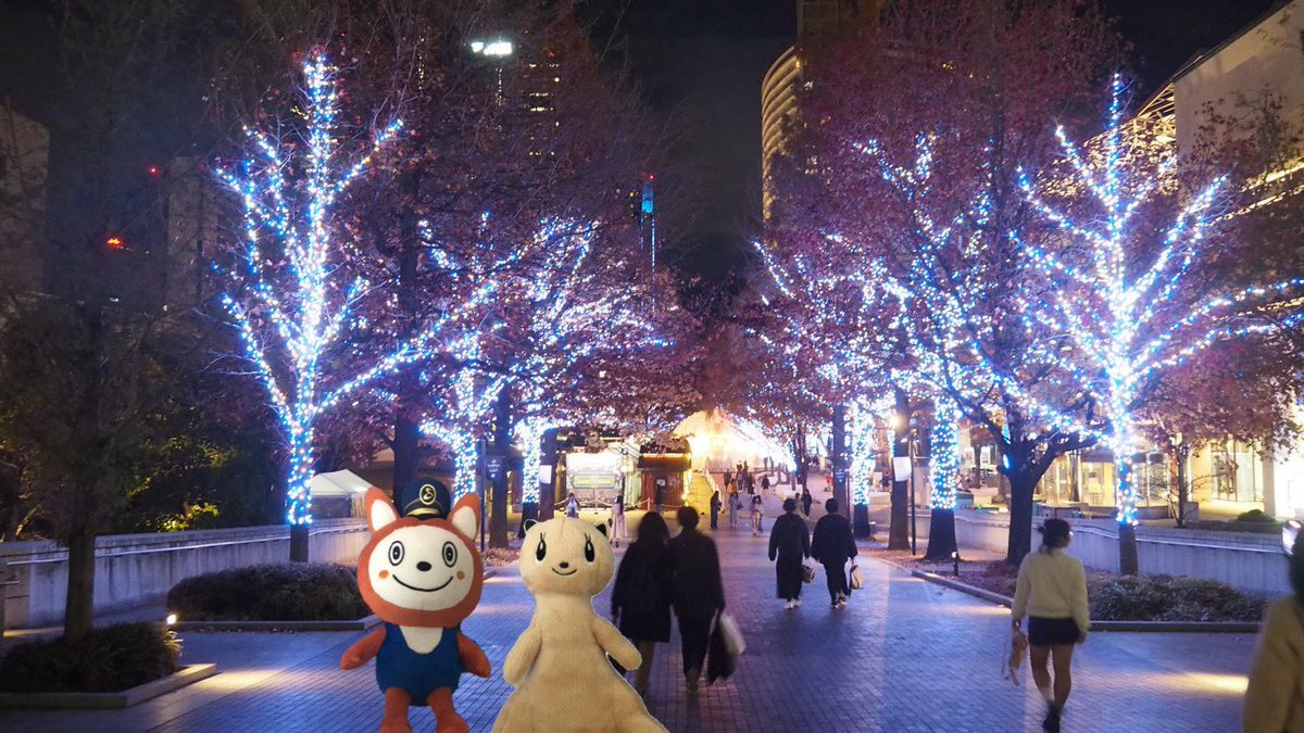 そうにゃん「ヨコハマミライトやってるよ。定番のブルーのイルミネーションだ」 フェレット「青いイルミネーションきれい。すごく長いね」 #ヨコハマミライト#イルミネーション#そうにゃん#nimoca pic.x.com/KuP4BG0JLX