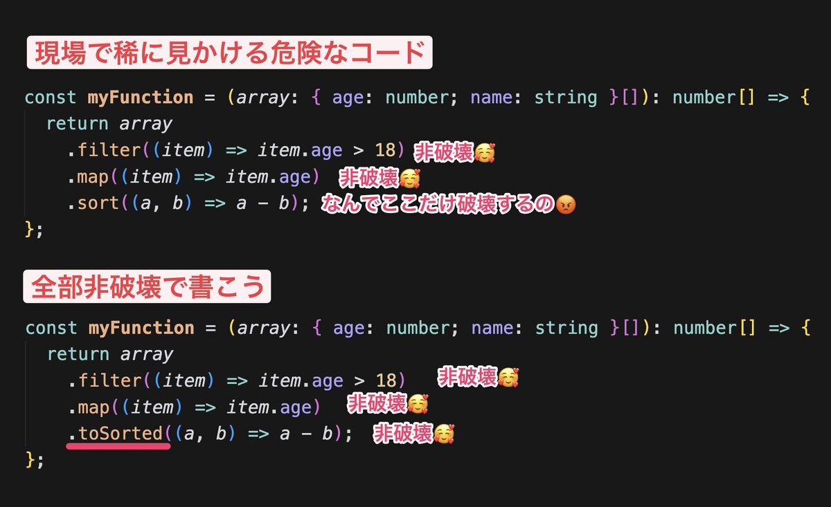 新しく構築された配列を破壊するのは別に良くないか? (んまぁ変更した結果破壊されるみたいなケースを考慮するべきかもだが) それよりも, 破壊されたくないならまず型にreadonly付けない? x.com/tonkotsuboy_co…