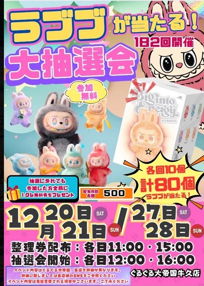 今週と来週の土日は,ラブブ抽選会の開催! 今回は,各回ラブブ10個当たります! 抽選会後ハズレてしまった抽選券を使って UFOキャッチヤー(100円)1回遊べちゃいます! 1日2回開催 ○1回目 11時:抽選券配布 12時:抽選会開催 ○2回目 15時:抽選券配布 16時:抽選会開始 遊びにきてね^_^ pic.x.com/dP4EstqOWH