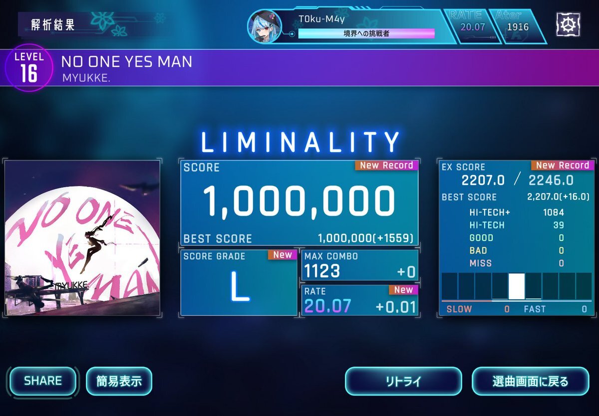 NO ONE YES MAN[Wiz] - 1000000(+1559) #lim_game #Liminality この曲の略称でお姉さんって呼んでる人がいるらしいですね(wiki情報) だれが言い出したのかどういう切り方してるのかはさっぱり分かりませんが pic.x.com/X0k255MHEG