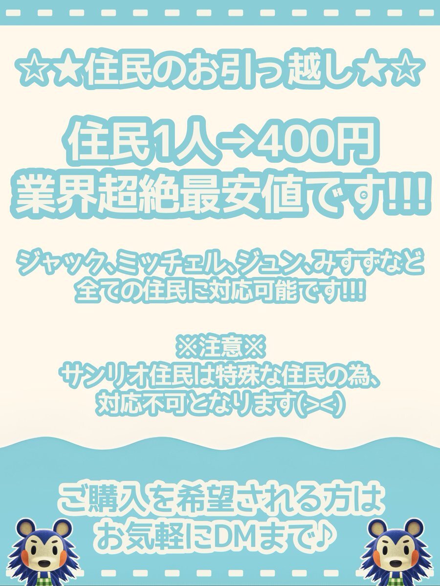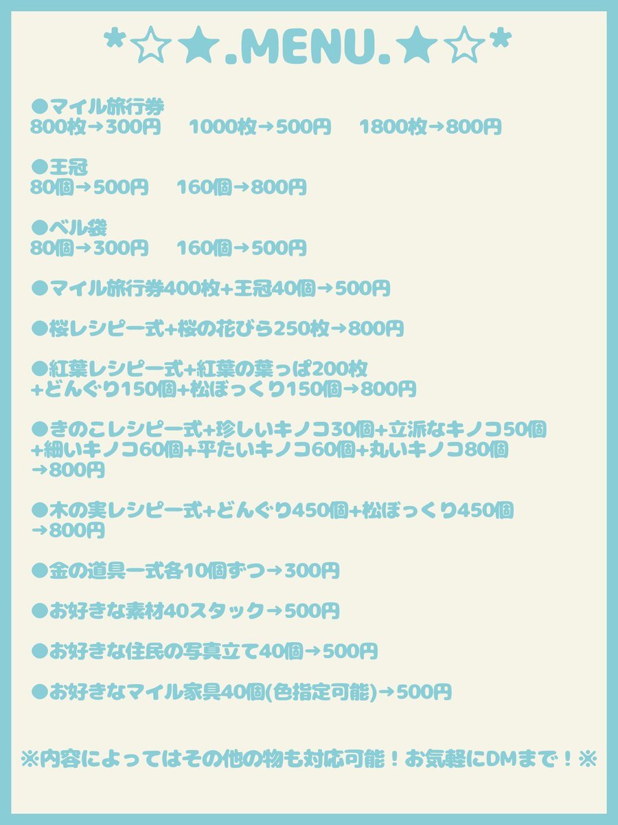 ✨本日もご注文随時受付中‼️現在即返信⭕✨ 🛫マイル旅行券800枚⏩300円 🏡住民の引越し1匹⏩400円 その他メニューは画像をご覧下さいませ♪ ご注文はお気軽にDMまで!🥰 #あつ森交換 #あつ森無償の輪 あつ森 交換 譲 求 住民 譲渡 カブ価 カブ活 島開放 住民譲渡 ガチコンプ あつまれどうぶつの森 pic.x.com/MbDjWM6Oda