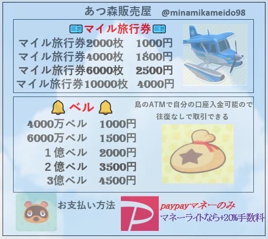 【あつ森販売 本日のご依頼受付中】 🎟️マイル旅行券4000枚=1800円 🔔1億ベル=2000円 🐻住民1つ+2000万ベル=1200円 🏝️アイテム取り放題1時間=1500円 ✨その他の販売コースは画像✅👇 📩DMで受付中📩 あつ森 住民 交換 譲 求 カブ価 #あつ森交換 #マイル旅行券 #ベル #ジュン #あつ森無償の輪