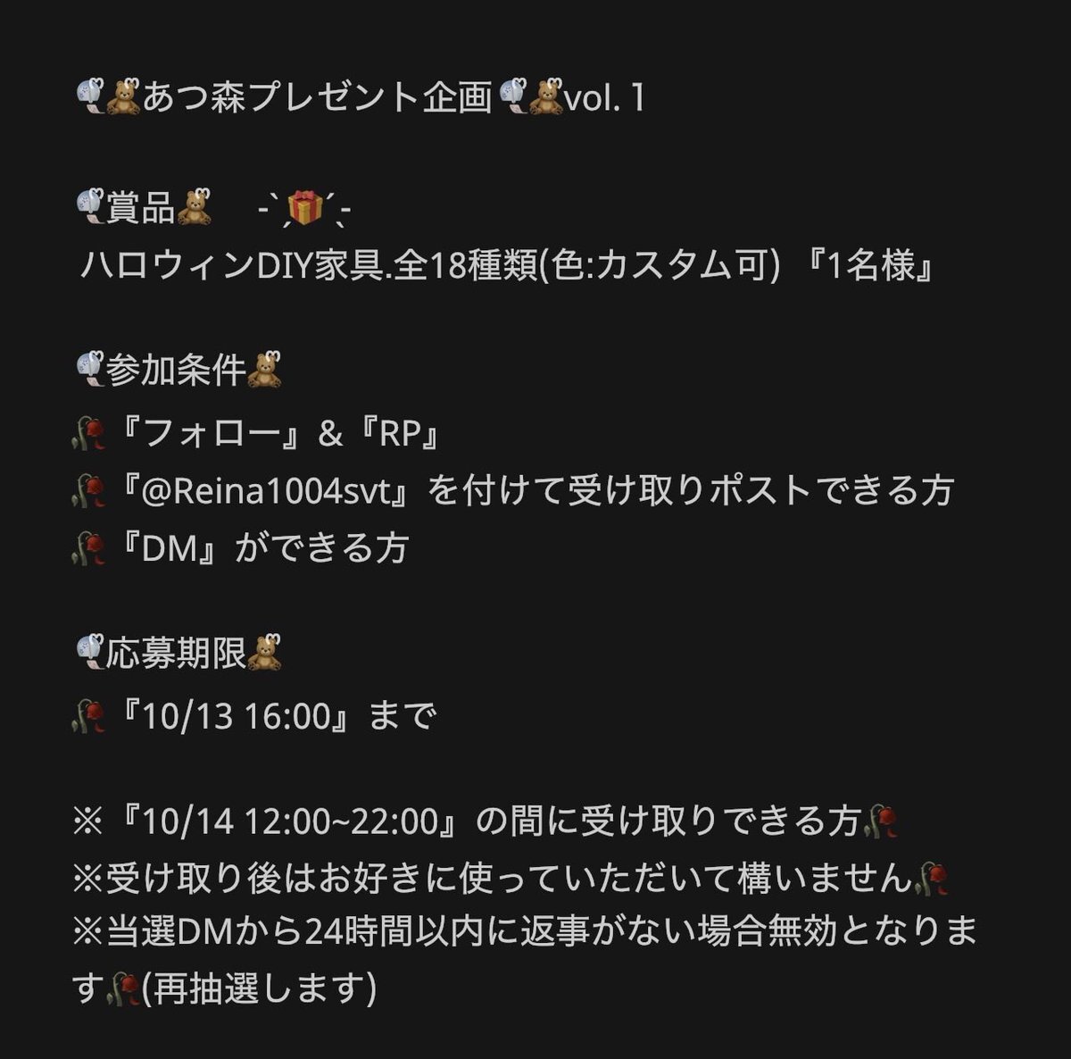 🎐ᩚ🧸ᩚあつ森プレゼント企画🎐ᩚ🧸ᩚvol.1 🎐ᩚハロウィン期間に入ったので 祝プレゼント企画開催します🎁 🎐ᩚ引用元から参加お待ちしています 🎐ᩚ引用元の画像よく読んで参加お願いし ます 🎐ᩚ今日の16時までだよ〜 #あつ森交換 #あつ森無償の輪 #あつ森プレゼント企画 x.com/reina1004svt/s…