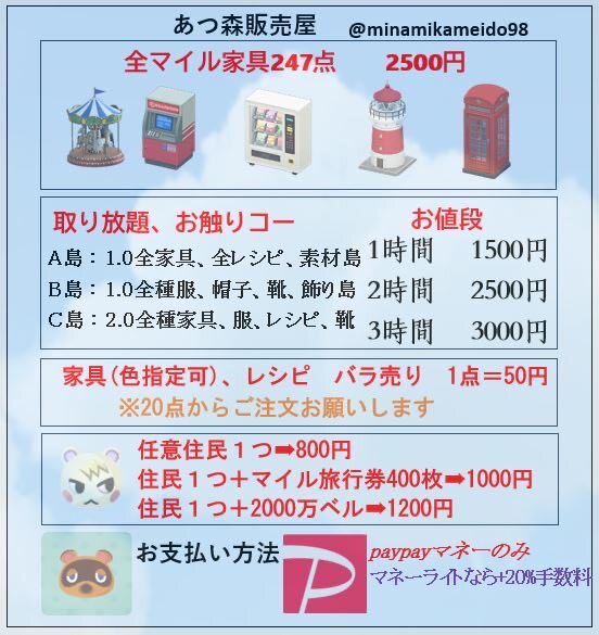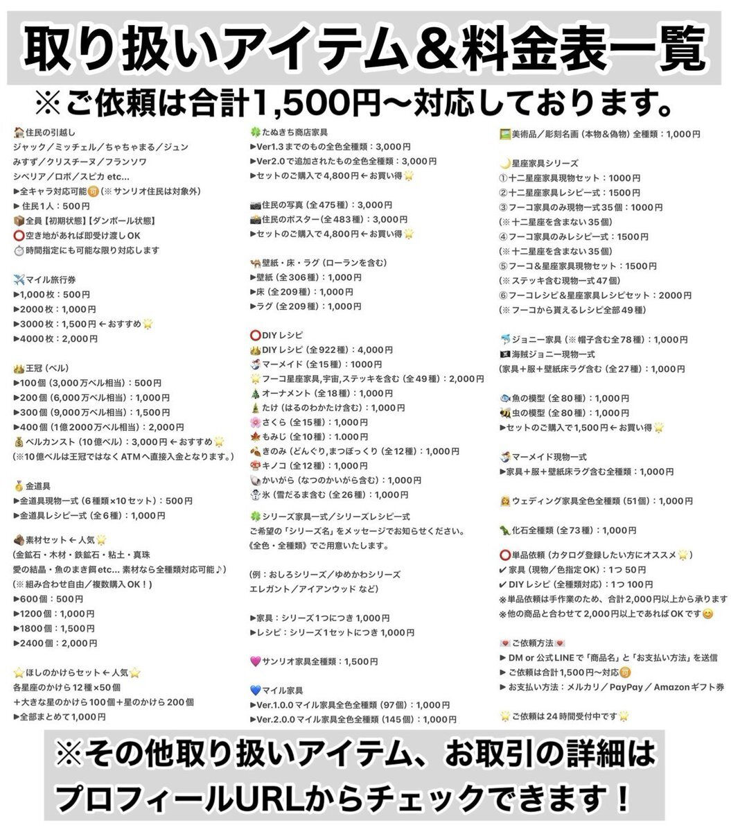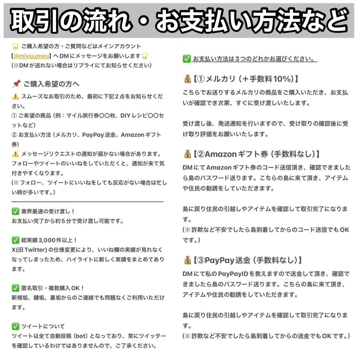 🏝️あつ森販売 ご依頼受付中 🌟初めての方へご案内📩 ▶ 初回のDMは通知届かない場合があります。スムーズな取引のため【フォロー+いいね】で通知を飛ばしてください✨ ▶ 返信が遅い場合もありますが、必ず返事します🙇‍♂️ #あつ森交換 譲求 カブ 住民 #マイル旅行券 #ベル #あつ森無償の輪 x.com/berutyann1009/…