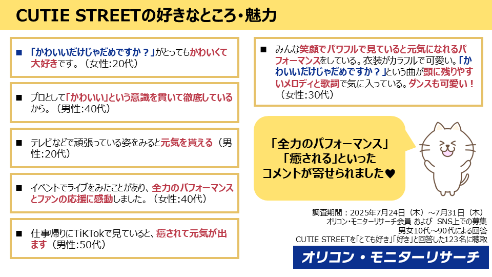 ◤結果発表📣◢ オリコン・モニターリサーチで CUTIE STREETのミニ調査を実施しました📝 好きなところ・魅力として、 「全力のパフォーマンス」「癒される」といった コメントが寄せられました💎 🔽詳細は画像をチェック📸 #CUTIESTREET #きゅーすと pic.x.com/NrmmdRujGG