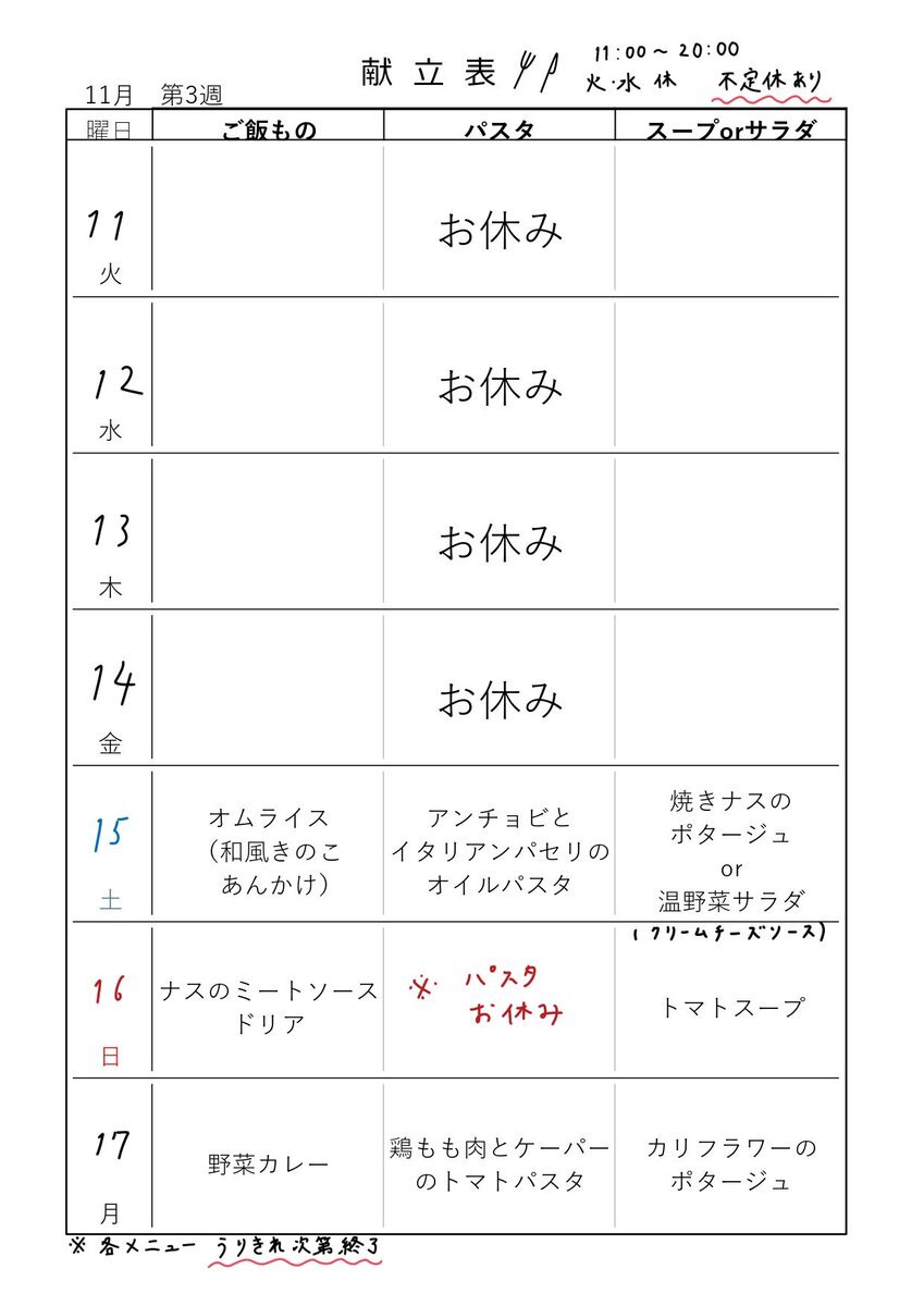 11/15(土)〜17(月)の献立です。 【16(日)はパスタはお休みをいただきます。】 #とびみけ堂の献立 #沼袋 #中野区 #西武新宿線 #駅前 #テイクアウト #持ち帰り #弁当 #洋食 #自家焙煎 #水出しコーヒー #ムジカティー #自家製ジュース #高知アイス #パスタ #スープ #サラダ #栄養士監修