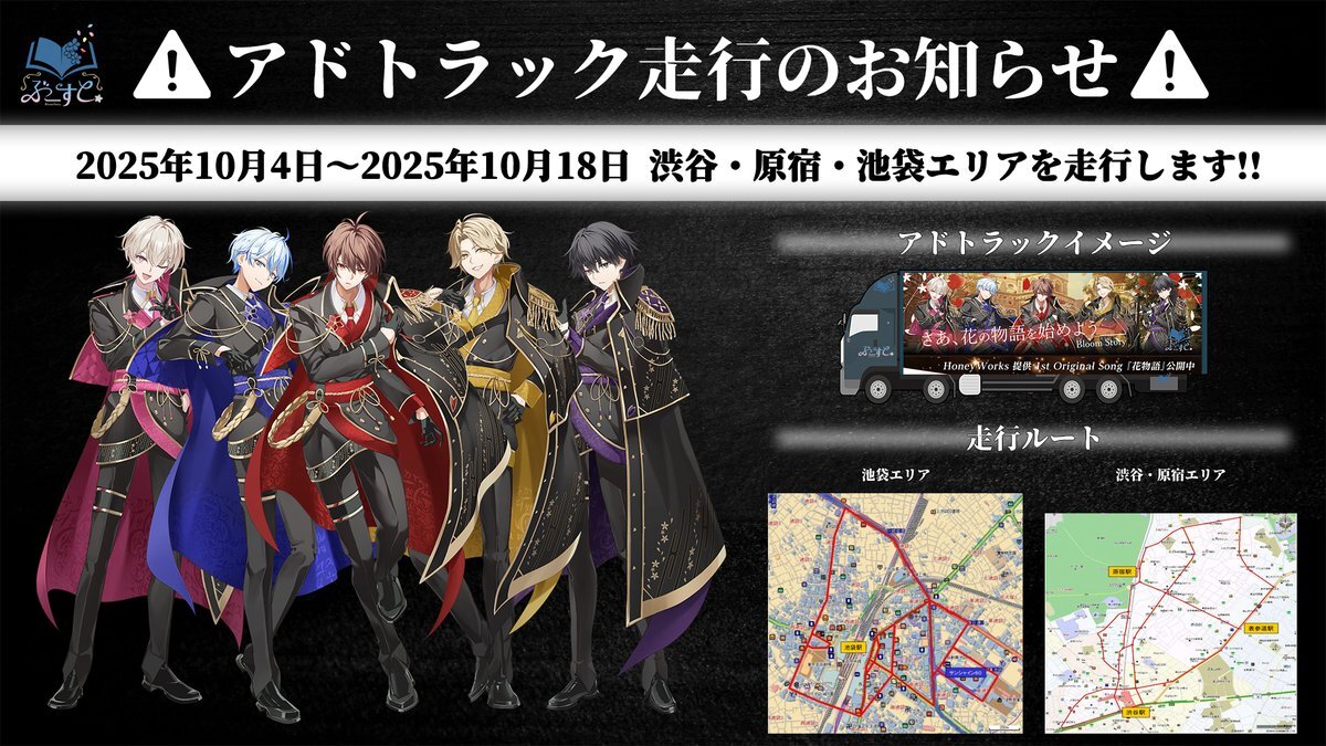 ❀お知らせ❀ 「ぶーすとアドトラック」本日は渋谷・池袋エリアを走行! 明日の走行エリアは下記をご確認ください。 📍10月13日(月)走行エリア 原宿 - 11:00〜14:30 渋谷 - 15:40〜19:00 見かけたら写真を撮って、SNSで拡散してねっ📲 tiktok.com/@bloom.story/v… #ぶーすと x.com/BloomStory_inf…