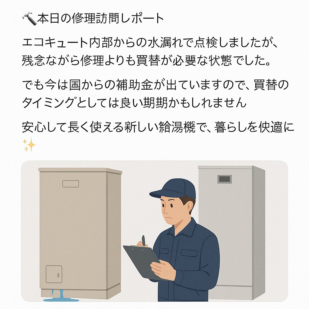 エコキュートの修理依頼で伺ったところ、内部からの水漏れで買替が必要でした。 実は今、国の補助制度が利用できるため、買替の良いタイミングでもあります。 「壊れて困ってから」より「補助がある今」に動く方が安心・お得かもしれません💡 気になる方はお気軽にご相談ください! #国富町 #地域密着 pic.x.com/KNEbcMkpnW