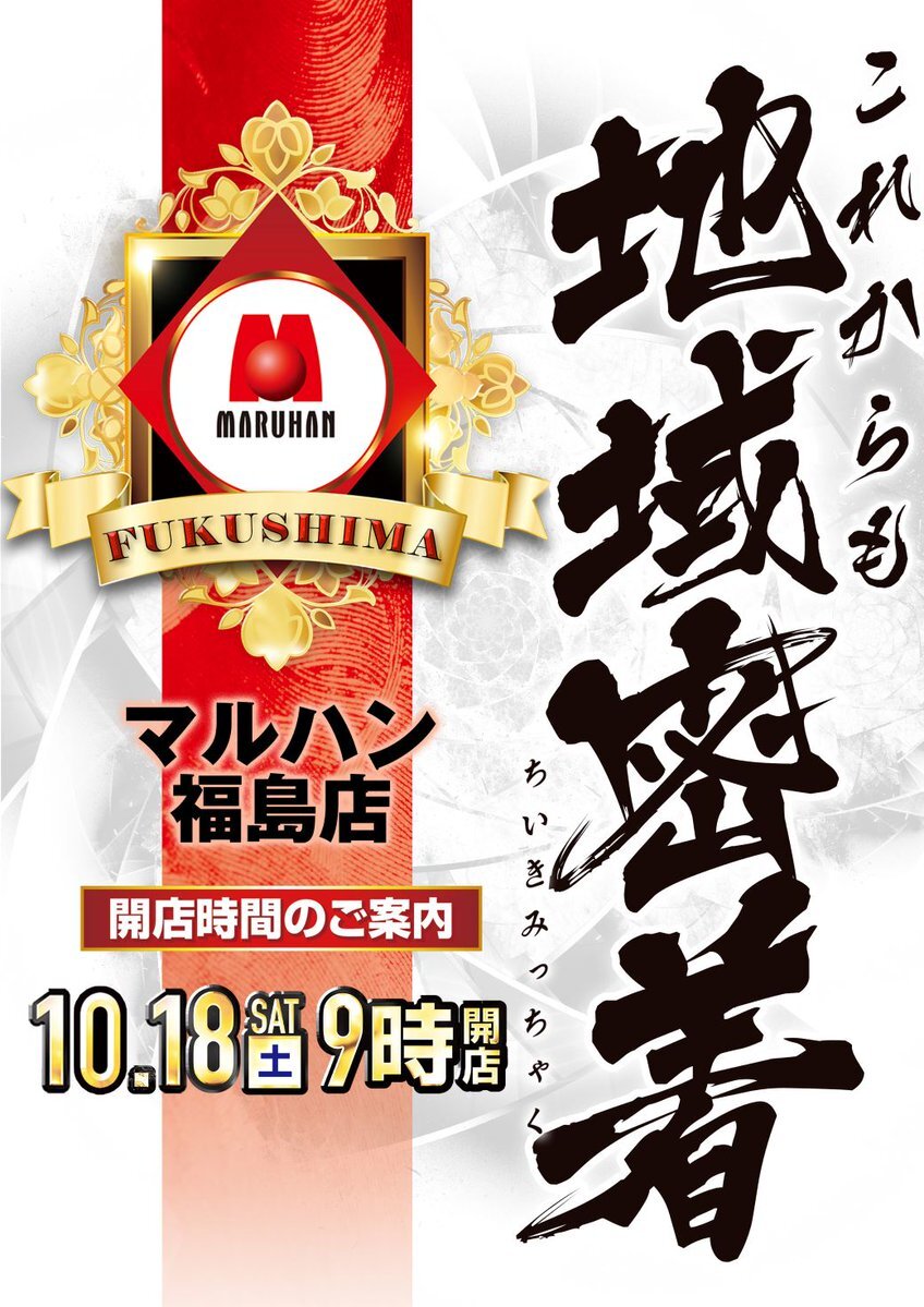 マルハン福島店です💫💫 🕘10月18日(土) 9:00 OPEN🕘 🍀『 これからも地域密着 』🍀 🍀『  週末もマルハン  』🍀 🍀 抽選開始時間8時35分 🍀 皆様のご来店‼️‼️ お待ちしております🔥🔥 #マルハン福島 #地域密着 pic.x.com/AO2fB8DJ49
