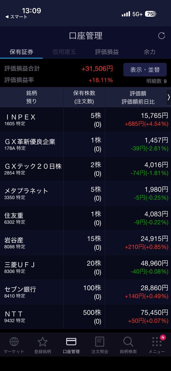 日経平均は大幅安でも、手持ちの日本株関連の評価額は僅かであるがプラス。 よしよし😀 #投資 #資産運用 #日本株 #株式 #REIT