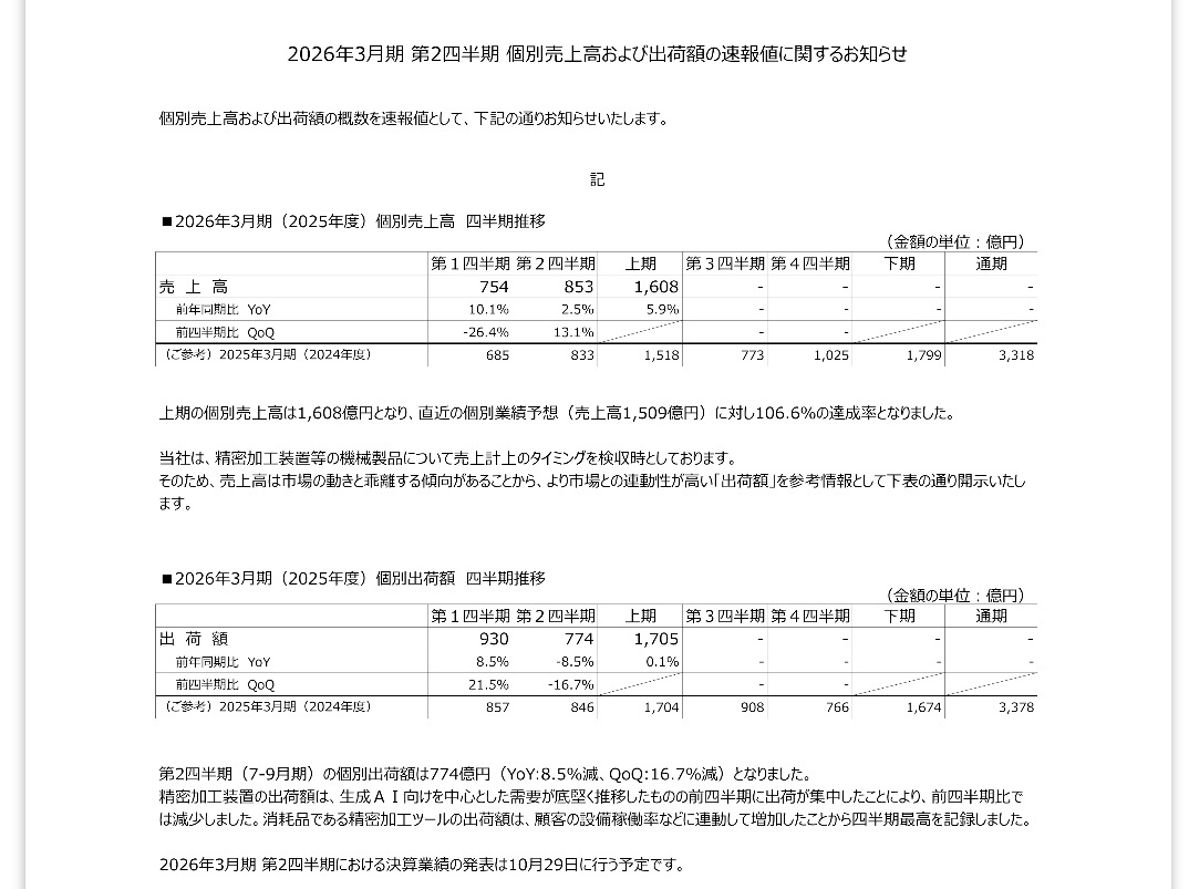 ディスコ[6146]:2026年3月期 第2四半期 個別売上高および出荷額の速報値に関するお知らせ 2025年10月6日(適時開示) :日経会社情報DIGITAL:日本経済新聞 nikkei.com/nkd/disclosure… #日経会社情報