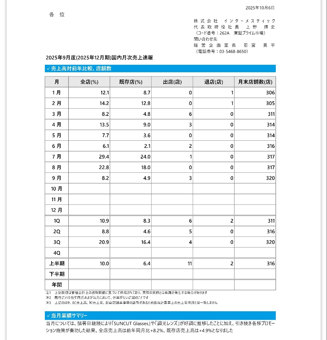 インターメスティック[262A]:2025年9月度(2025年12月期)国内月次売上速報 2025年10月6日(適時開示) :日経会社情報DIGITAL:日本経済新聞 nikkei.com/nkd/disclosure… #日経会社情報 pic.x.com/tsFudiM0bA