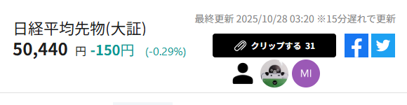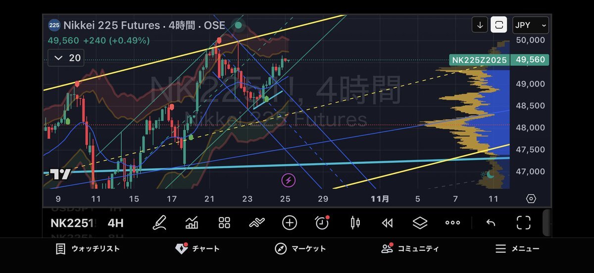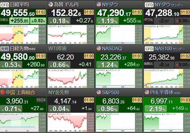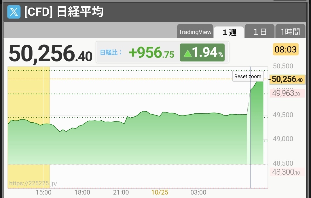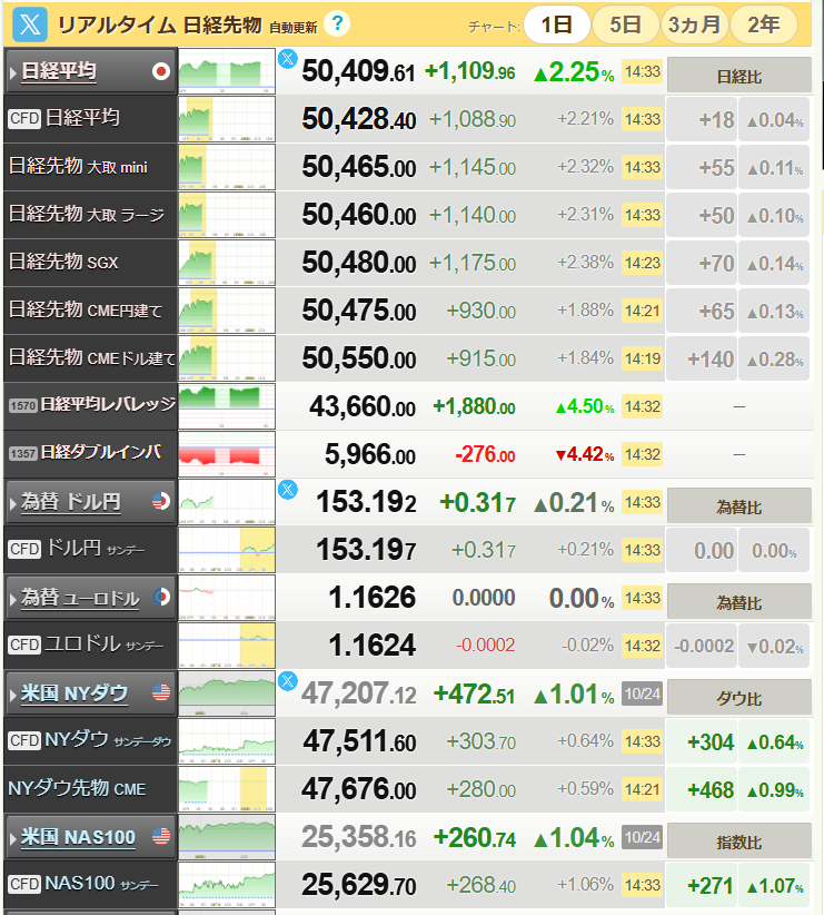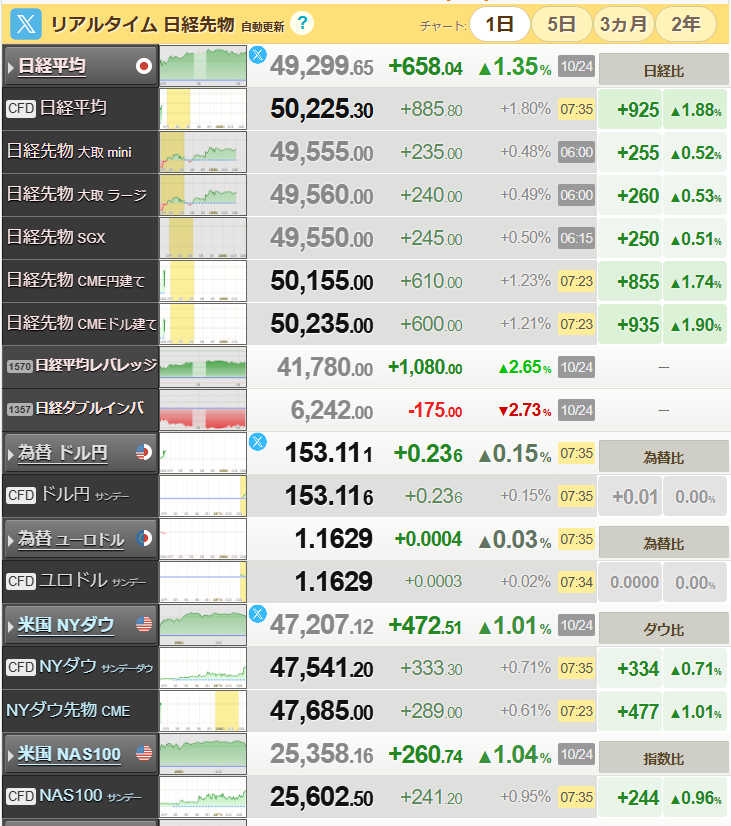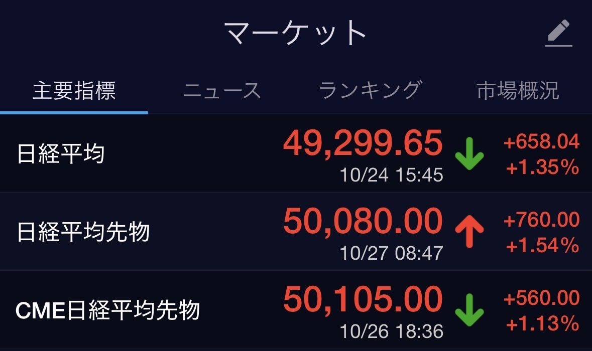 米国ダウも絶好調🇺🇸 防衛大臣が危険人物でも、なぜか市場は「高市フィーバー」 …株価上げるより、ラーメンの値段下げてくれよ そして、日経225先物は週末限定モード🔥 10/24の取引では49,130円→49,320円、+0.4%の上昇。 夜間の先物市場では勢いさらにアップ!49,560円まで上昇してる