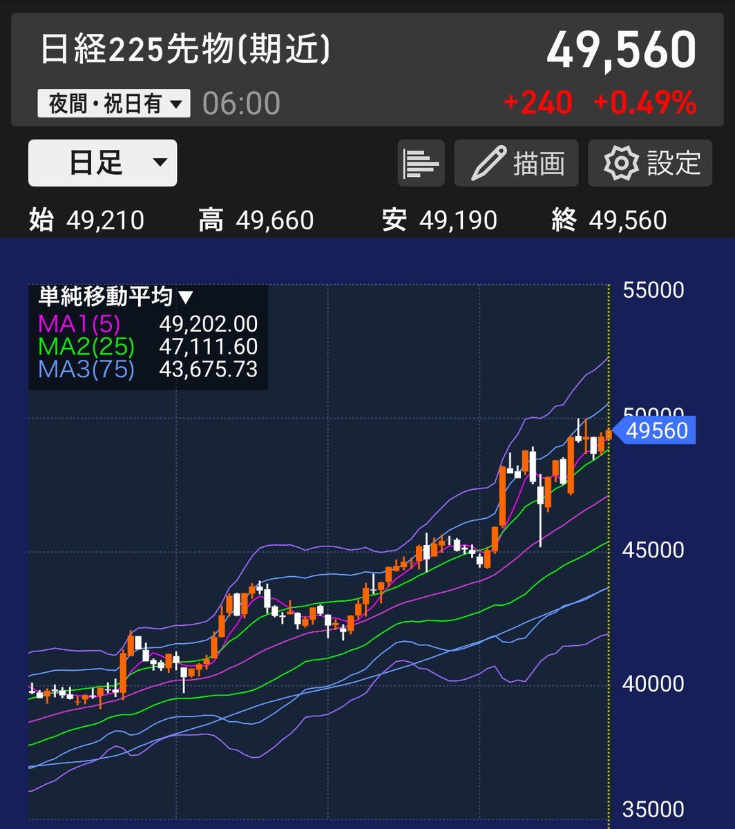 おはようございます! #日経平均先物 +0.49% 49,500円奪還。 なかなか下落しませんね。 高市トレード継続中です。 #投資初心者さんと繋がりたい #投資家さんと繋がりたい #投資初心者 pic.x.com/RqhQtxol6y