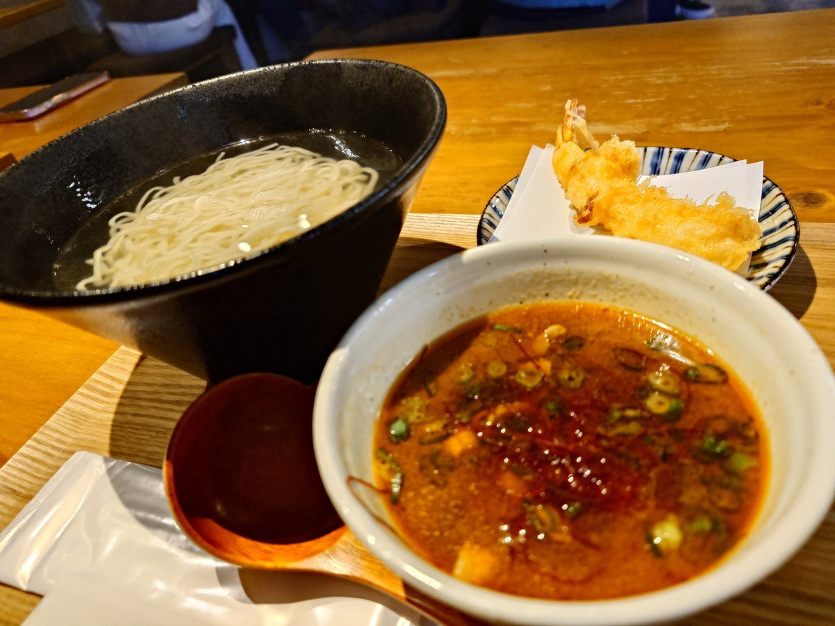 平日ランチにうどん 細くて、ツルツルつけうどんに、ちょっと甘めのつけ汁がクセになる 今日は、旨辛肉うどん(温)with 海老天 辛いけど、山椒オイルや深煎七味は ないとダメ 箸も使い易くてすき #益うどん #本八幡 pic.x.com/OrtQsdS83f