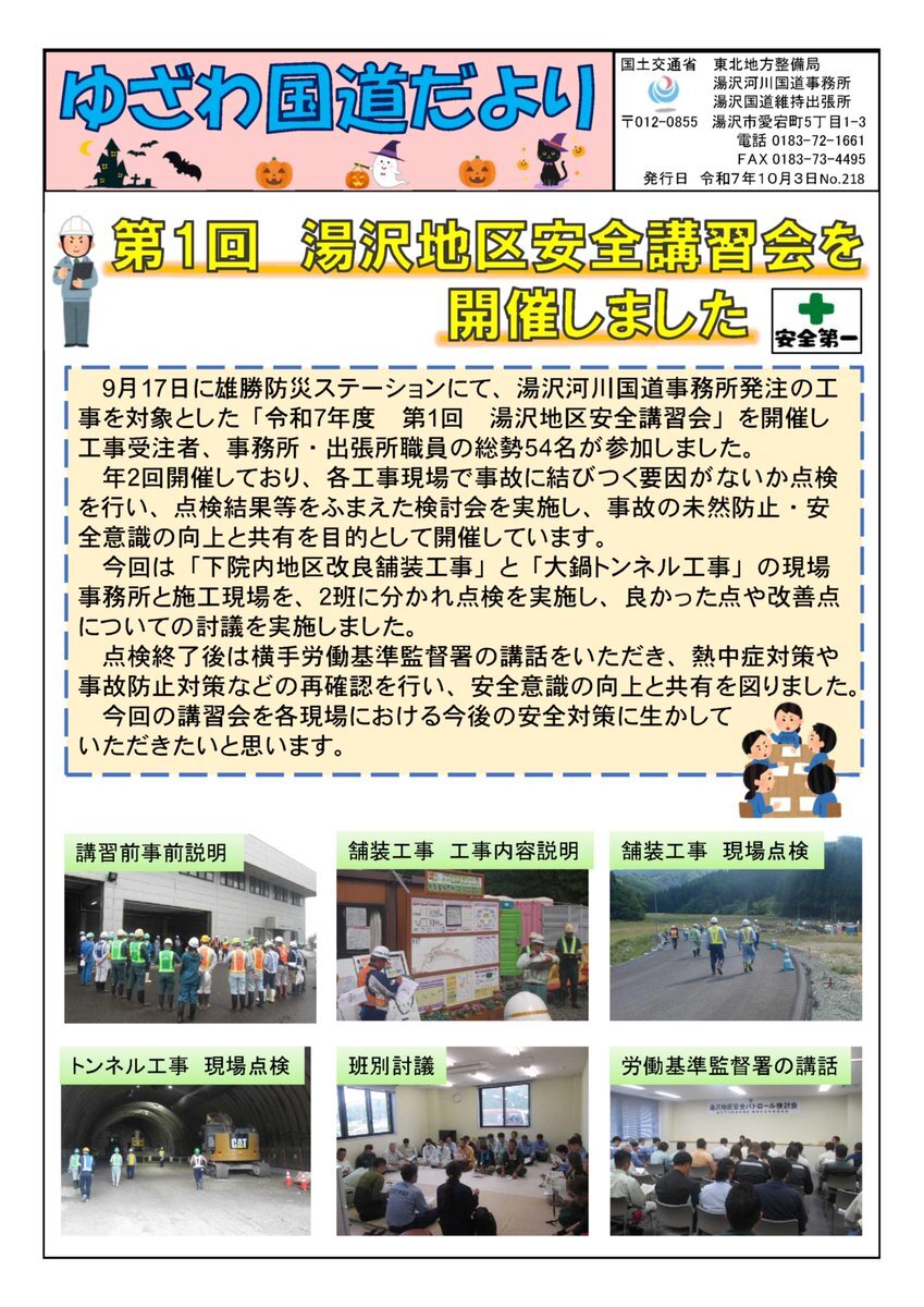 🔶出張所ニュースを発行🔶 #湯沢国道維持出張所 より「 #ゆざわ国道だより No.218」をお届けします。 今号は先月17日に行われた湯沢地区安全講習会の様子と出張所管内での工事規制のお知らせを掲載しています。ぜひご覧下さい。 #地域の守り手 #国道13号 #東北中央自動車道 pic.x.com/a5IJELM3at