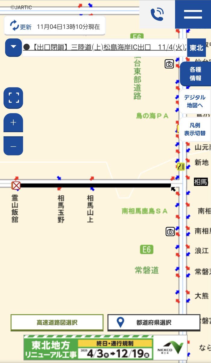 【通行止:開始】 路線区間:E︎13︎東北中央道(下り線)相馬IC~霊山飯舘IC 開始:1︎3時00分から 要因:故障車 最新の交通状況▼atis.co.jp/traffic/highwa… #東北中央道 ︎#通行止