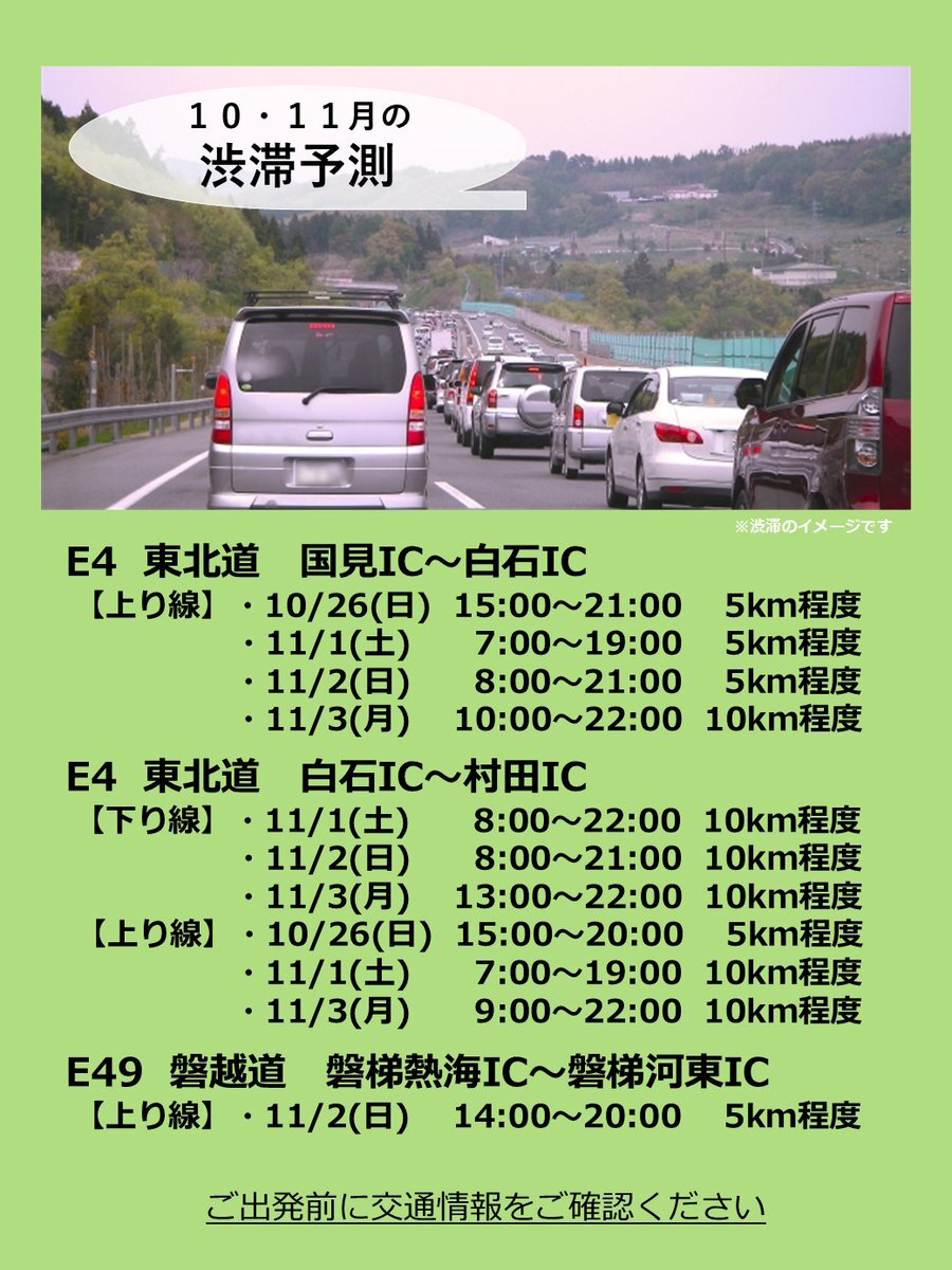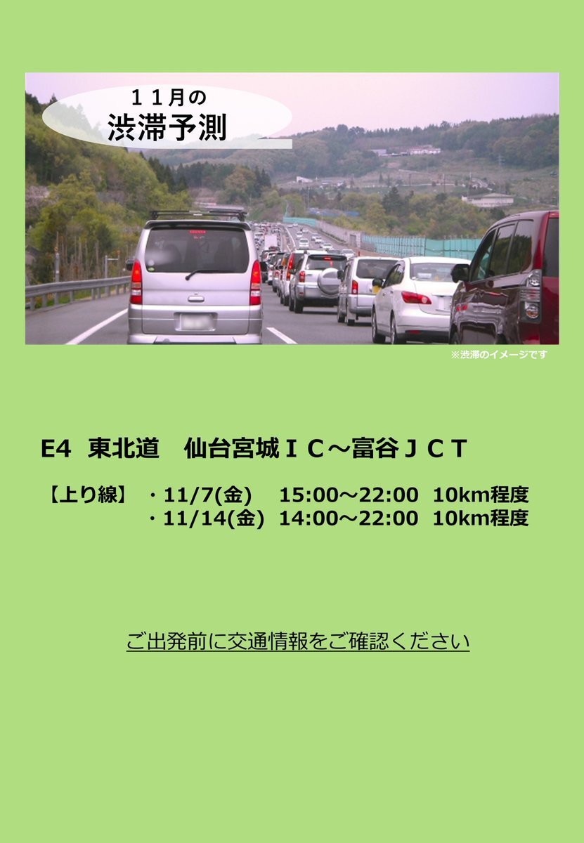 【#渋滞予測】 #東北道 5km以上の渋滞発生を予測しています。 渋滞予測を参考に渋滞回避にご協力をお願いいたします。#常磐道への迂回 もご検討ください。 【東北道 仙台宮城IC~富谷JCT】 ◆上り線 11/7・14 10km程度 詳しくは添付画像をご確認ください。 drivetraffic.jp/congestion pic.x.com/nmQHI4BQX0
