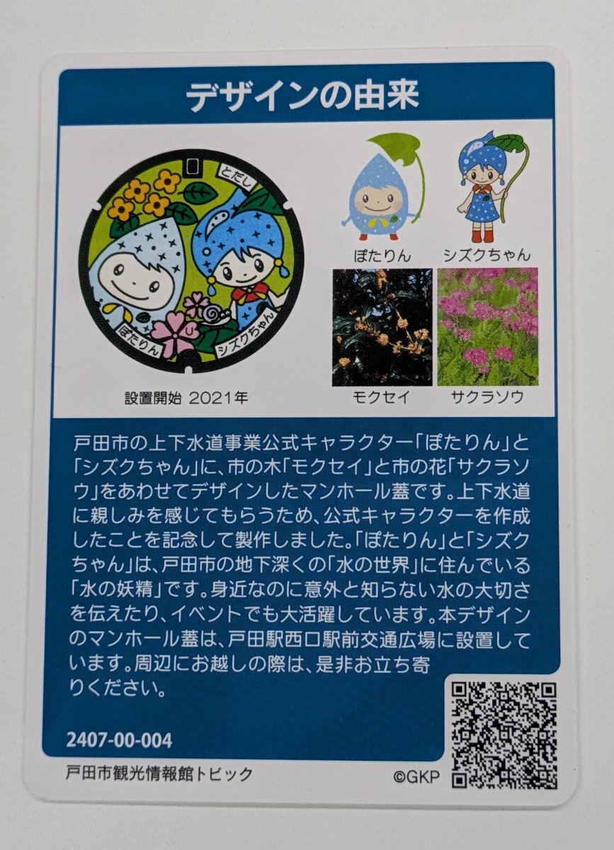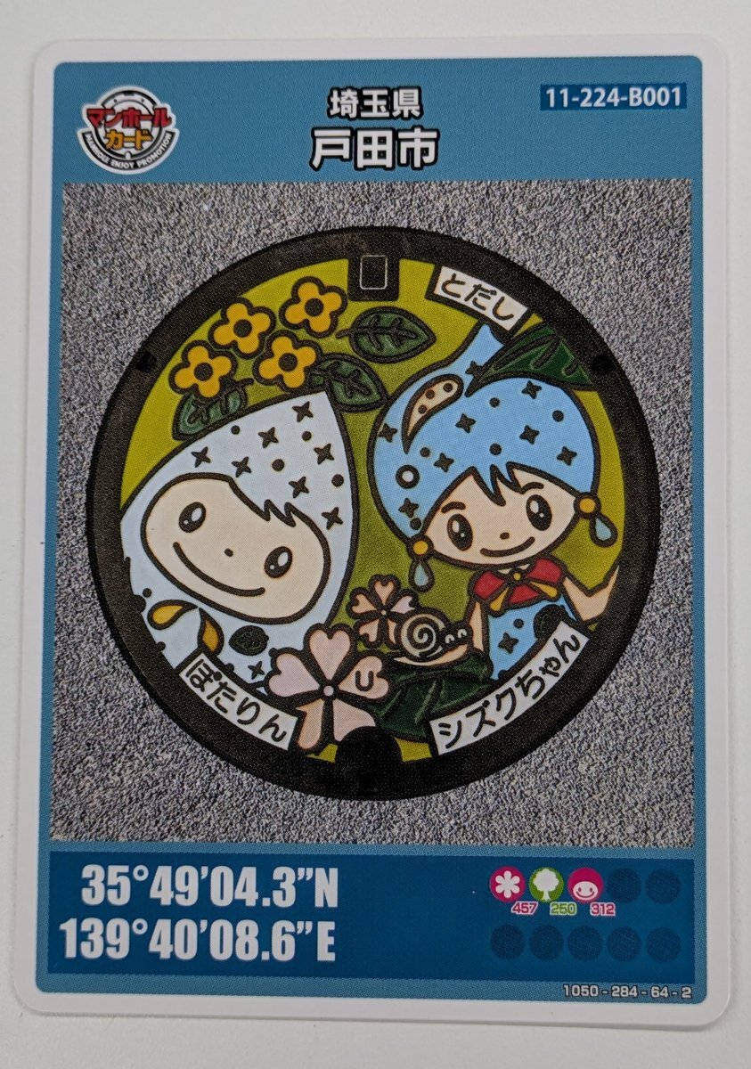 今回は...戸田市のマンホールカードです♪ 戸田市の上下水道事業公式キャラクター「ぽたりん」と「シズクちゃん」がデザインされたマンホール蓋です✨ とてもかわいいマンホール蓋ですね~🥰 #測量 #上尾 #二和 #マンホールカード #戸田市 pic.x.com/iHUeDtI7ao