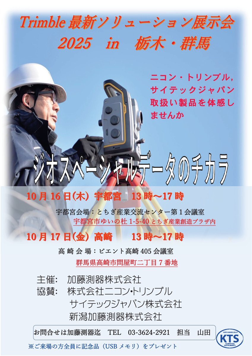 【群馬・栃木の建設・測量・建設コンサル業の方へ】 \必見!最先端の測量機器を“触って”試せる展示会/ 参加無料&記念品も🎁✨ 📍宇都宮会場|とちぎ産業交流センター  (10月16日 13時~17時) 📍高崎会場|ビエント高崎  (10月17日 13時~17時) 💡TLSやSLAM等、最新3Dレーザースキャナ