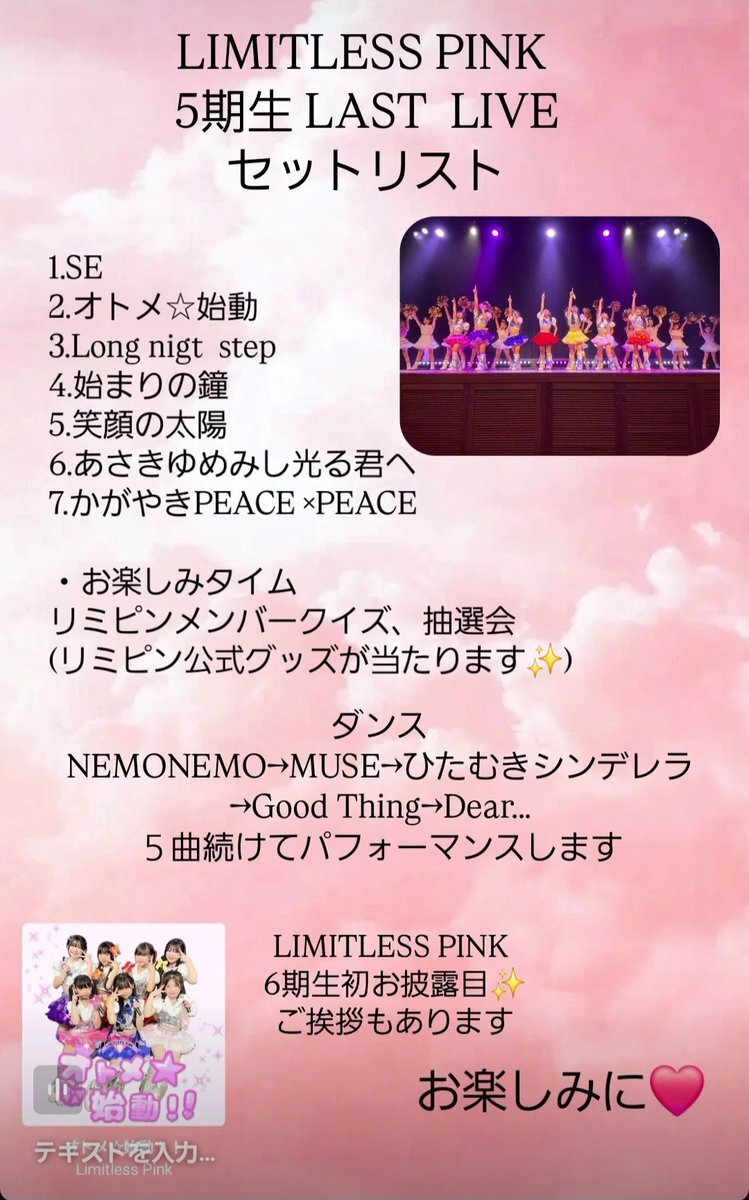 2025.12.21 LIMITLESS PINK 5期生 LAST LIVE セットリストです。 7曲全て披露するのは今年最後かもしれません、、🥲 みんな頑張っています! #福井 #アイドル #キッズ pic.x.com/lzkzlGl4Qe