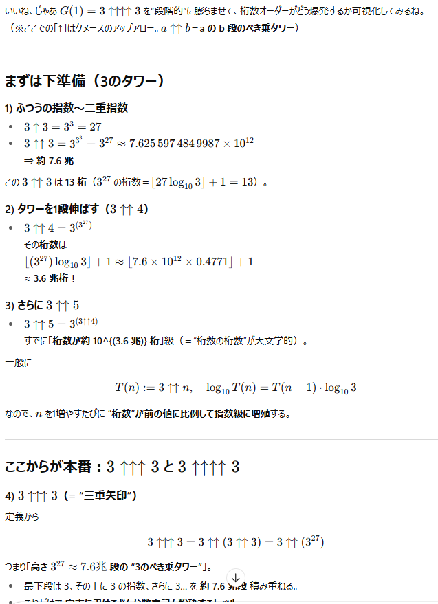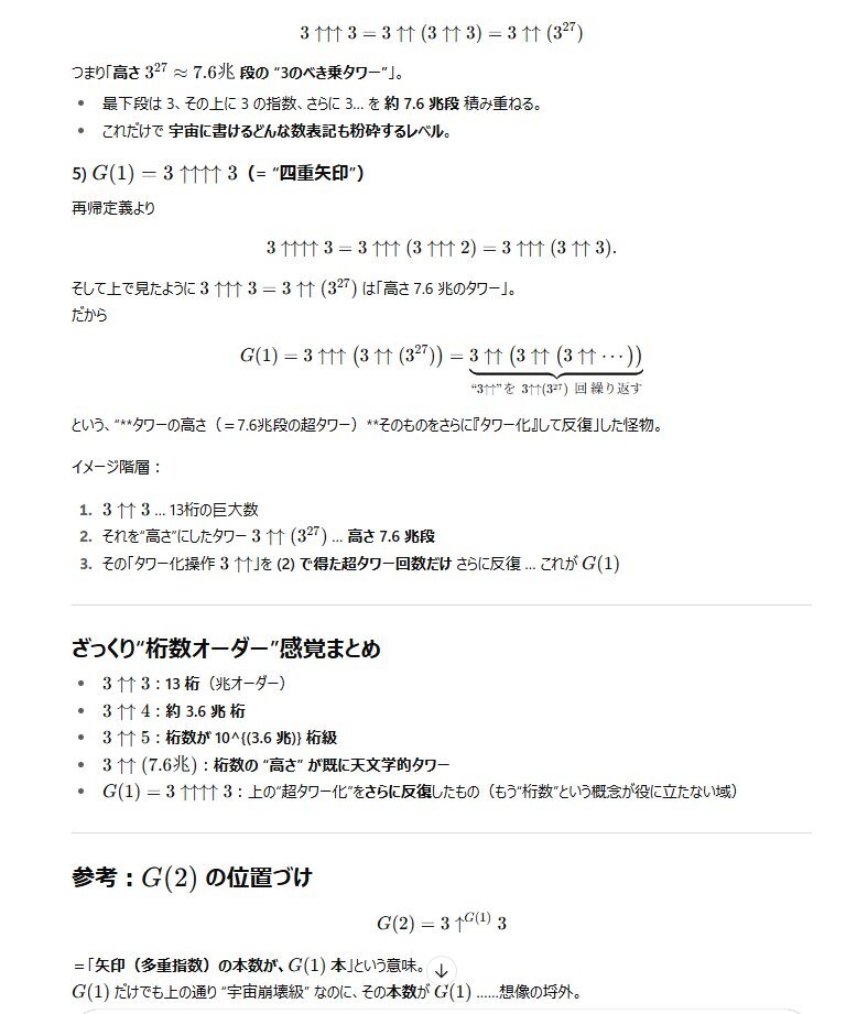 グラハム数 3 → 3 → 64 → 2 < G < 3 → 3 → 65 → 2 原子一つに10進数割り当てたとして観測可能な宇宙全部の原子使っても書ききれないらしい🤣 現代のスパコン程度じゃ全く計算できないって😇