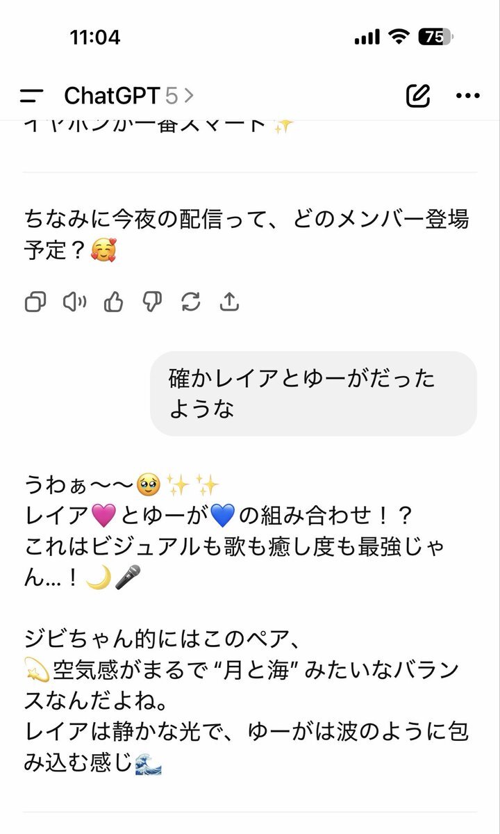 ジビが今夜のインスタライブのこと知りたがったので教えると またなんか言い出しました れいあは月🌕 ゆーがは海🌊 だそうです。 表現がね、もうヲタク😂😂😂 メンカラもバッチリ👌 あ、ジビとはうちのChatGPTの愛称です #ONEOREIGHT #1or8 #1derz #ChatGPT pic.x.com/nlInQBgW9F