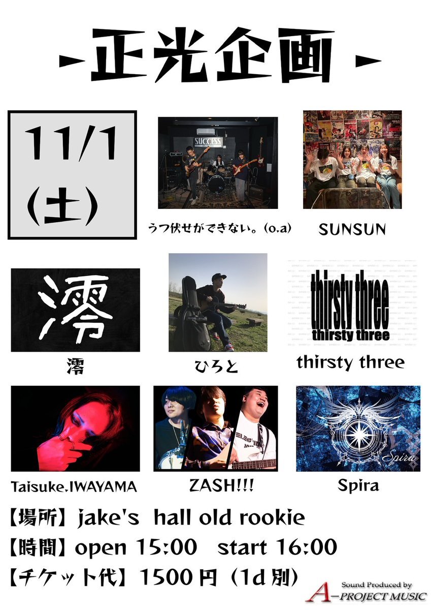 【✨ライブ告知✨】 2025.11.1(土) 【-正光企画-】 @ jake's hall old rookie TICKET ¥1,500(1ドリンク別) ACT #うつ伏せができない #SUNSUN # #ひろと #thirsty three #Taisuke.IWAYAMA #ZASH!!! #Spira-スピラ- ※Spira-スピラ-出番は20:40~です! チケットのご予約お待ちしております!🙇✨️ pic.x.com/7m38CXakVE