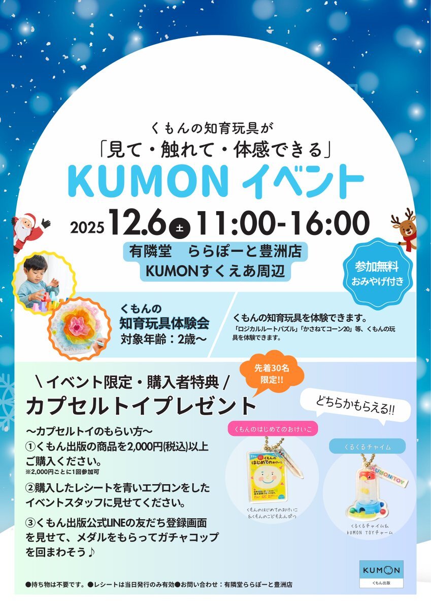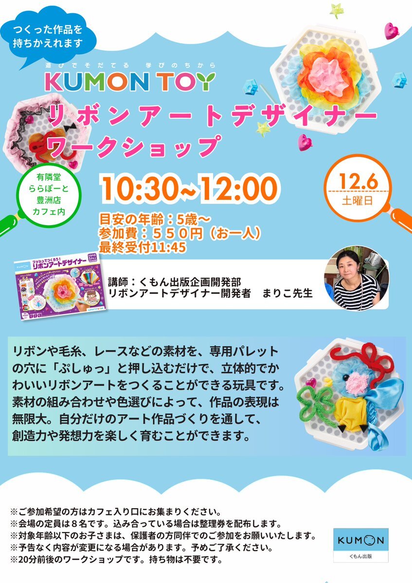 🎉12/6(土)は #有隣堂 ららぽーと豊洲店 に集合!🥳 #KUMON のワークショップや抽選会を行います。 ワークショップご参加の方には、併設カフェ「#StoryTable」にて当日のみセットドリンク無料のサービスも☕️ 是非遊びに来てくださいね♪ #豊洲 #ららぽーと #イベント情報 pic.x.com/pgGWk0Xb6c