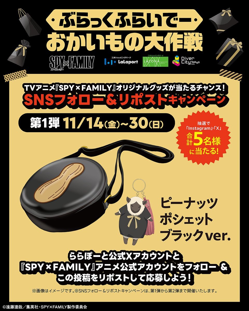 / TVアニメ『SPY×FAMILY』 プレゼントキャンペーン開催! \ 全2回のプレゼント企画がスタート! ①@lalafanlalaport をフォロー ②@spyfamily_anime をフォロー ③11/30(日)23:59までに本投稿をリポスト