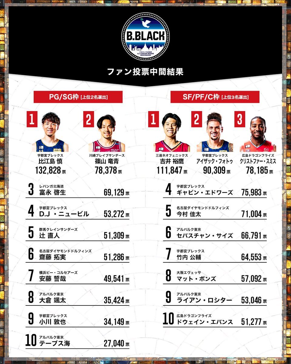 🌟#Bリーグオールスター🌟 🗳ファン投票 中間結果を発表🗳 本日27日(月)午前8:59時点での順位はこちら! 投票は11月3日(月)23:59まで! #Bリーグ #りそなグループ x.com/B_LEAGUE/statu…