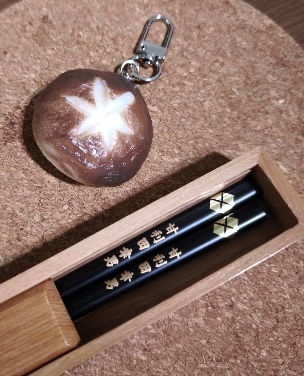 箸箱と椎茸キーホルダーほぼ特定です!(食品サンプルは手作り&箸箱は自然木なのである意味一点物ですね)※劇中のキーホルダー金具はワンタッチ型っぽかったです #おいしい給食 #マイ箸  #秀衡塗 pic.x.com/EIvXoH7bSK