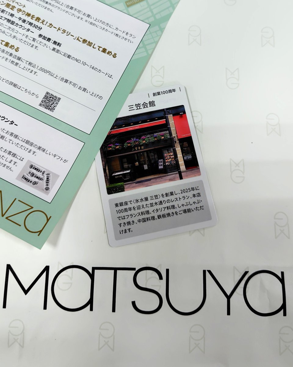 松屋銀座 開店100周年記念 「松縁祭」10/29(水)~11/11(火)開催 三笠会館は「GINZA CELEBRATION CARD」で参加 本店中2階 イタリア料理 トラットリア メッツァニィノで 1,000円以上のご利用で限定カードをプレゼント 詳細は松屋銀座HP shorturl.at/ymju6 #松屋 #銀座 #三笠会館 pic.x.com/NQBMktqcvu