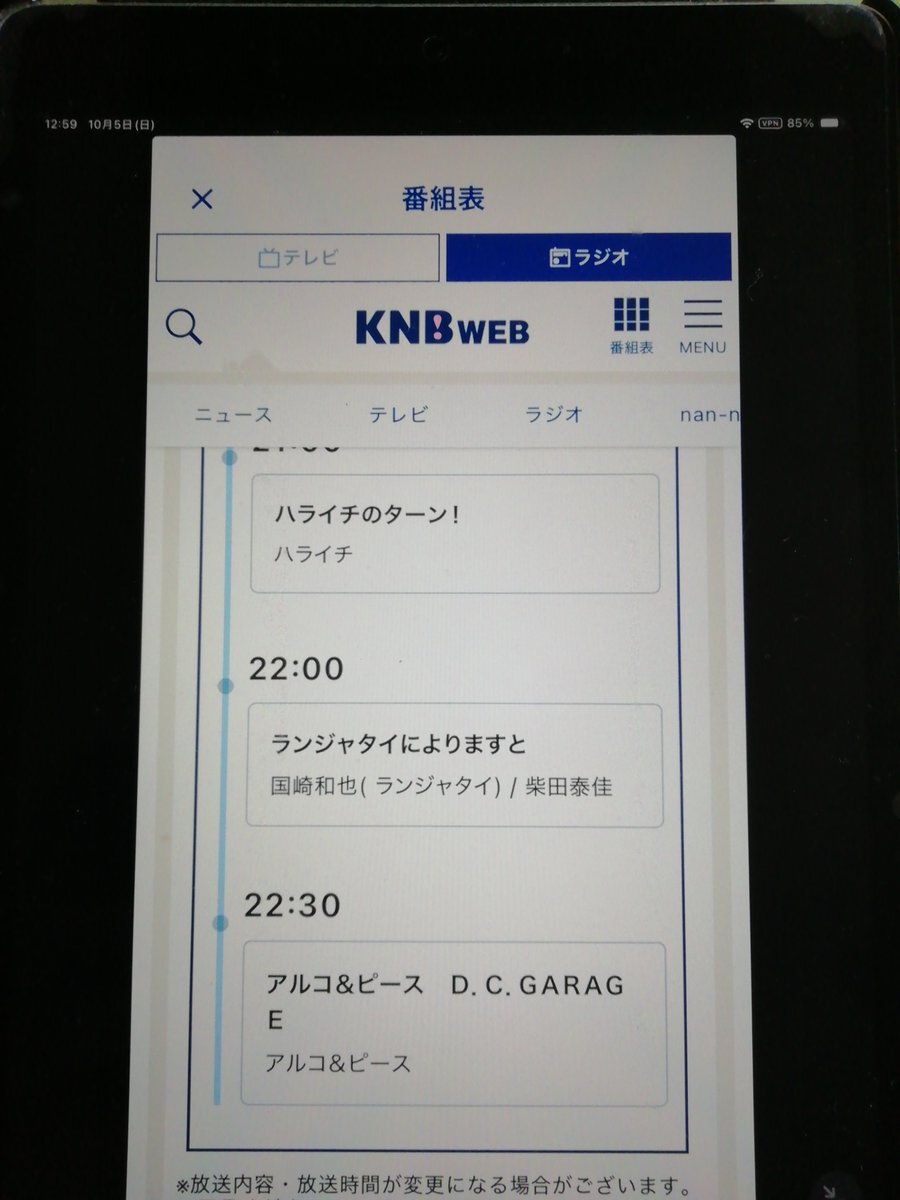 富山 #北日本放送 KNBアプリから。 秋改編で #KNBラジオ 日曜日の夜は #アルピーdcg が最終番組となりました。 23:30で放送終了。ちょっと早過ぎないか? これに伴い、 #あにまにあ のネット受けも終了。 #MROラジオ で10/5に放送される回からは 10局ネットでのOAとなります。 #おとなりさんラジオ pic.x.com/IwtZ72vamS