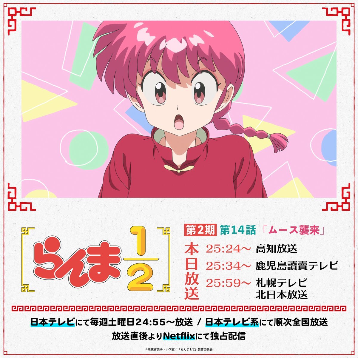 ⠀// 📢 本日は4つの放送局で放送! ⠀\\ 第2期2話目✨ 第14話「ムース襲来」 #高知放送:25:24~ #鹿児島讀賣テレビ:25:34~ #札幌テレビ:25:59~ #北日本放送:25:59~ 放送地域の皆さま、お見逃しなく!🍥 #らんまアニメ #ranma 📺TVアニメ「らんま1/2」第2期 日本テレビ系にて全国放送中 pic.x.com/PQ1xqEuhkg