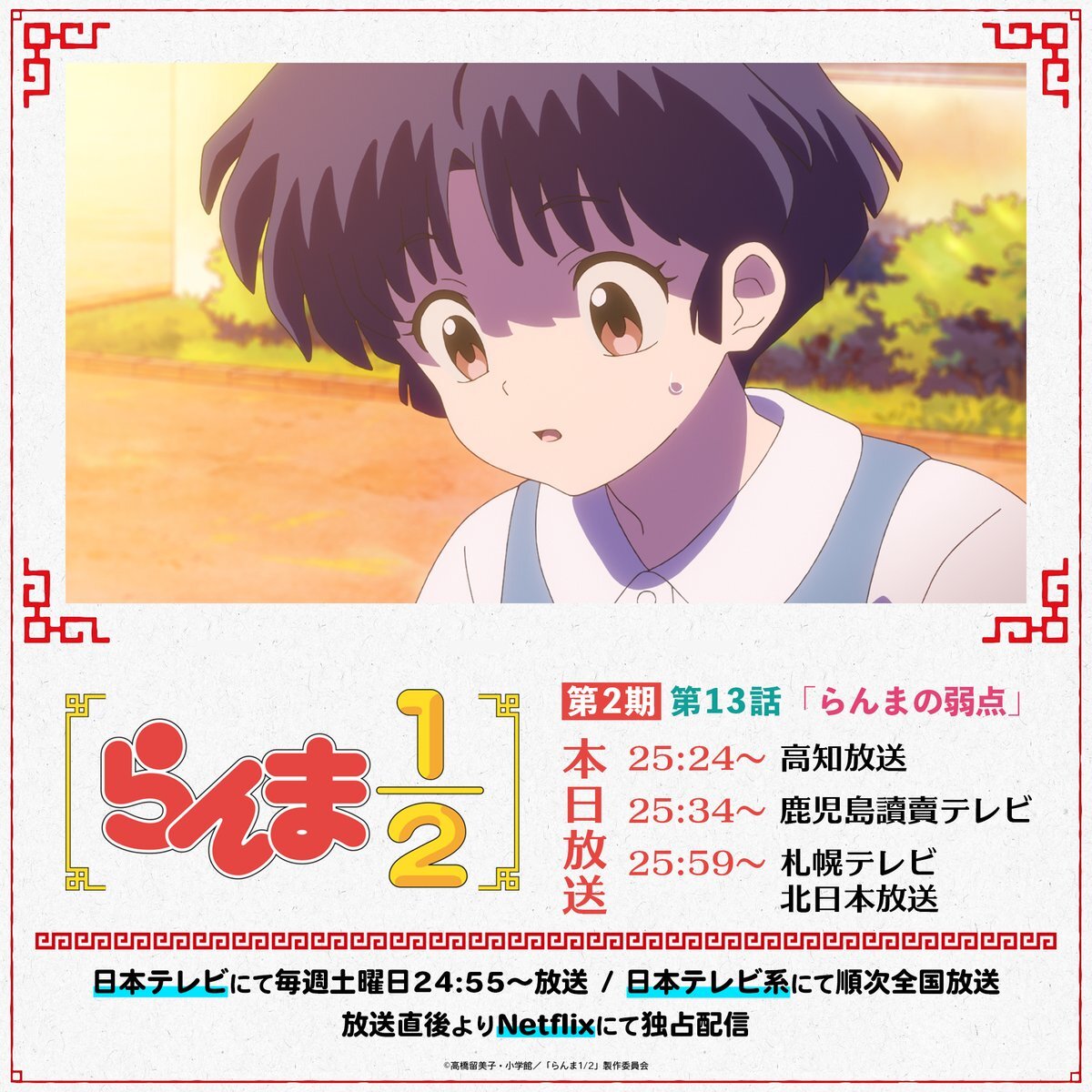⠀// 📢 本日は4つの放送局で放送! \\ 第2期1話目✨ 第13話「らんまの弱点」 #高知放送:25:24~ #鹿児島讀賣テレビ:25:34~ #札幌テレビ:25:59~ #北日本放送:25:59~ 放送地域の皆さま、お見逃しなく!🍥 #らんまアニメ #ranma 📺TVアニメ「らんま1/2」 日本テレビ系にて全国放送中 pic.x.com/bEAfp54JxY
