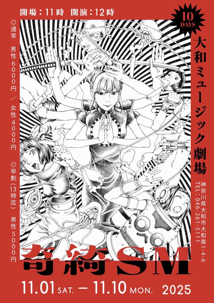 次回【奇綺SM】11月1日~10日 大和ミュージック劇場 新作盛り沢山‼️ 関連のお店やイベントに行った際には タグ付けポストお願いします❤️ 全体→ #奇綺怪快/@kikikaikai2021 劇場イベント→ #奇綺SM 単発イベント→ #奇綺怪快宴 高円寺のお店→ #奇綺/@kiki_koenji デパ→