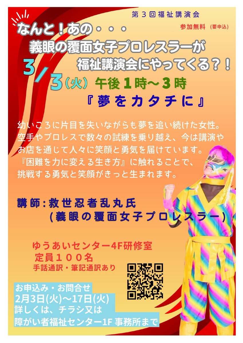 3月3日(火)13:00-15:00 高槻市障がい者福祉センター(ゆう・あいセンター)にて第3回福祉講演会を開催します。義眼の覆面女子プロレスラーが気になりますね。 #高槻市 #障がい者 #インクルーシブ #福祉講演会 #救世忍者乱丸 pic.x.com/PkrIvfhZwS