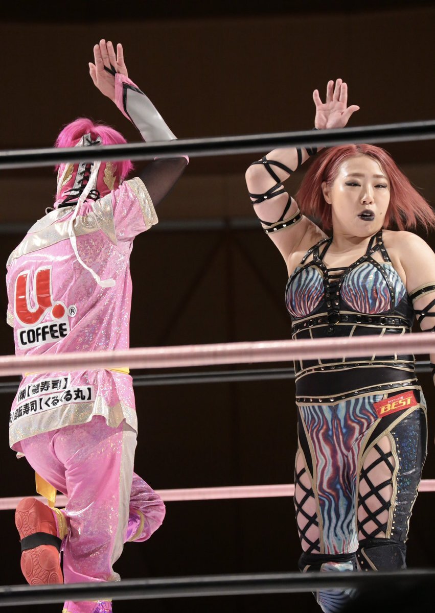 チサコさんのポーズを真似して何やら言ってた乱丸さん。もう試合中ずっと笑わされました😂 #DASH・チサコ #救世忍者乱丸 #SENJO pic.x.com/mdTGfN3Ji6